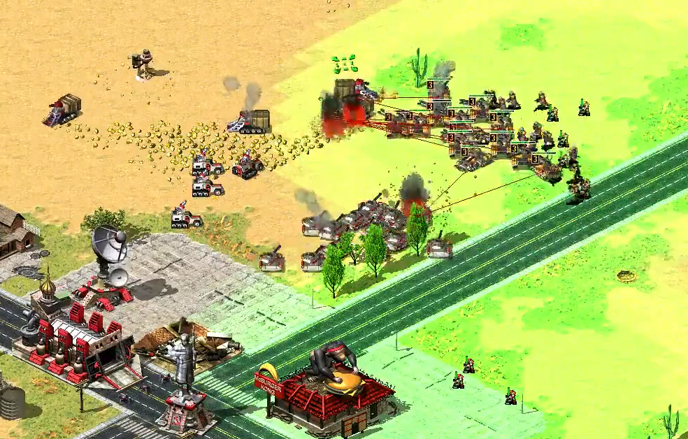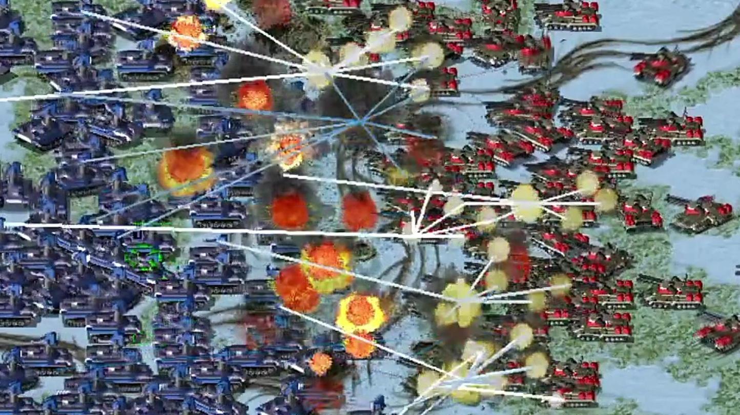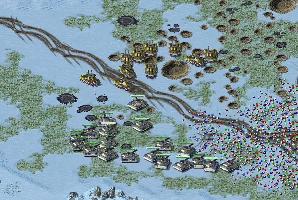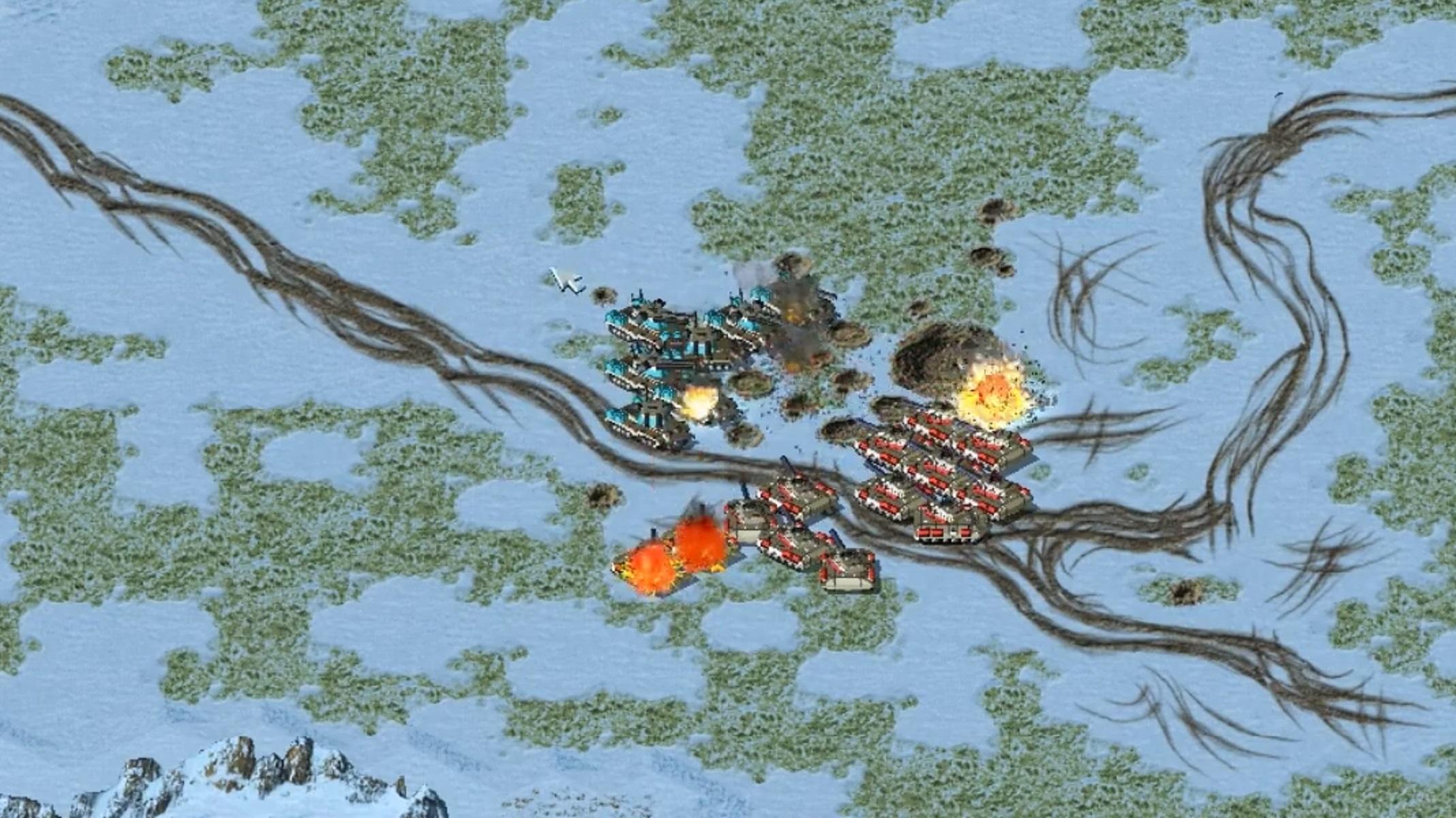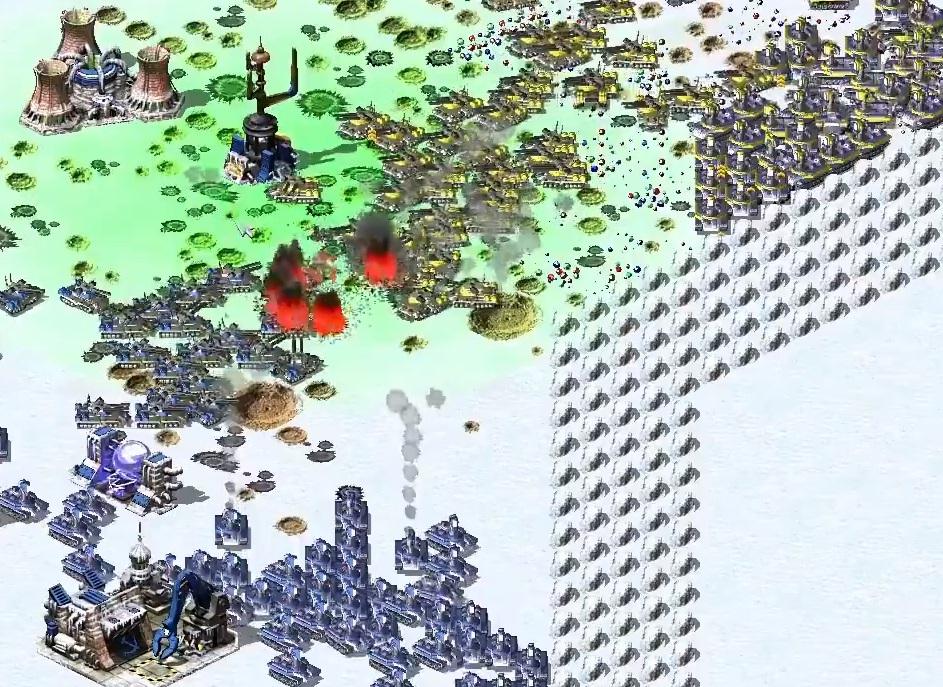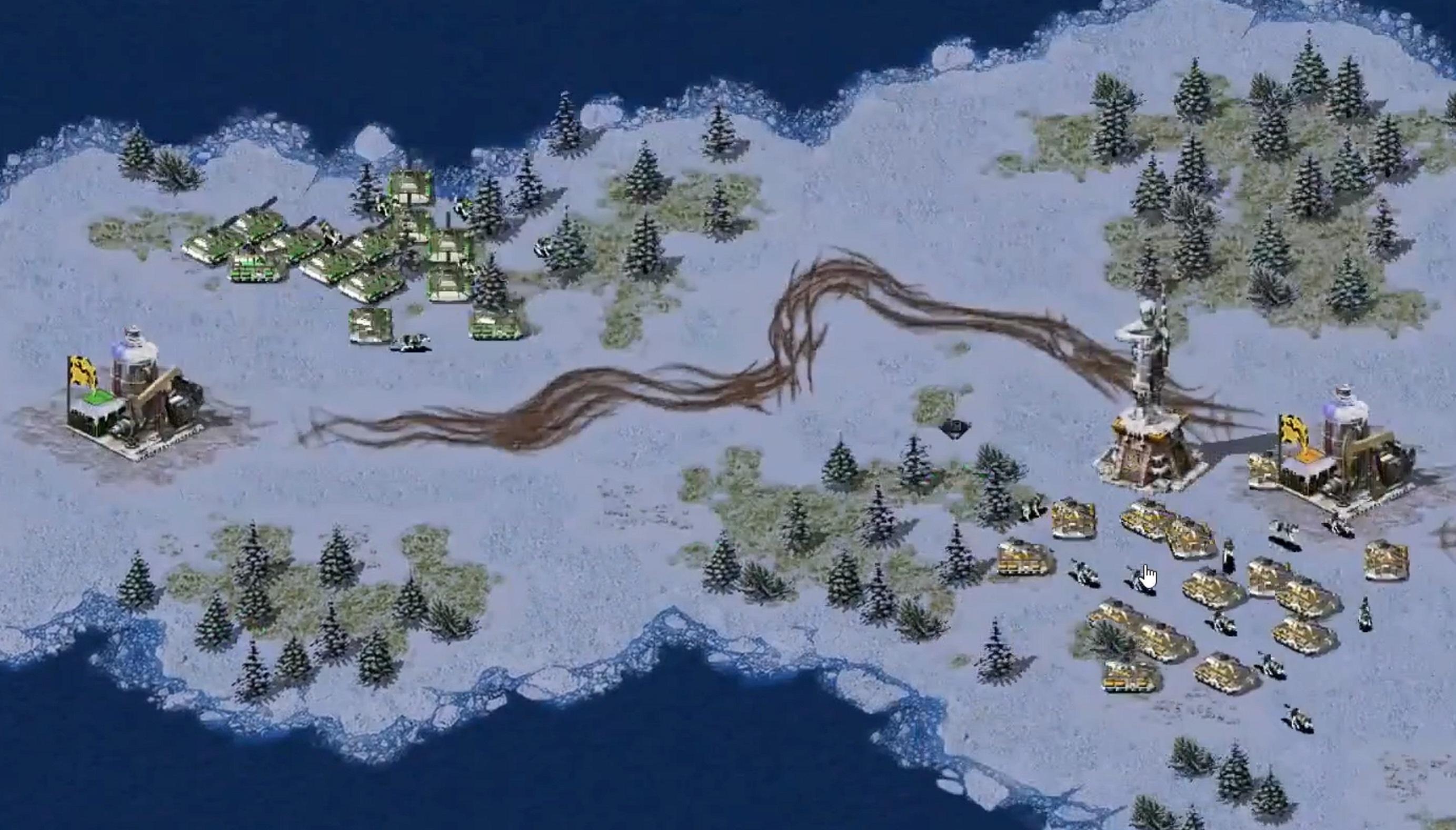 正因为如此,天启坦克也成为不少玩家非常喜欢的一种单位。当年《红警2》最喜欢做的事情,就是在白令海峡、北极圈这张地图,拆完桥之后,攒满密密麻麻的天启坦克,去平推六七个冷酷电脑。