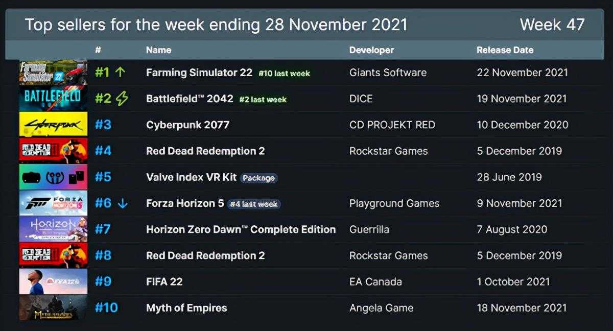 V社今天(11月22日)公布了Steam平台上周(11月22日至11月28日)销售排行榜,恰逢秋促期间本周榜单较上周新增了许多新面孔。首先是于本月22日新发售的《模拟农场22》,游戏首发便挤掉了二连冠的《战地2042》夺得榜首,《2042》滑落至第二,其后则是秋促期间好评骤涨的《赛博朋克2077》。