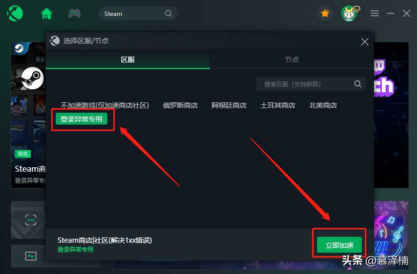 如果加速之后还是遇到登不上去,登录异常的问题,就在选择区服处选择“异常登录专用”进行加速,这是迅游专门为登录异常的小伙伴开设的加速专线,更换为这个区服加速的话,可以解决绝大部分的登录异常问题。