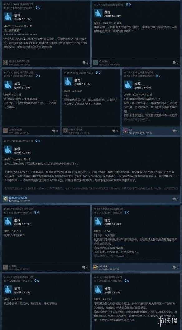 目前《曼尼福德花园》在Steam上总共有2000多条玩家评价,好评率96%、“好评如潮”,很多玩家表示这款游戏非常美,玩法很创新,堪称艺术品,但是其视角也非常容易晕3D,甚至有些玩家“物理意义上的吐了”。