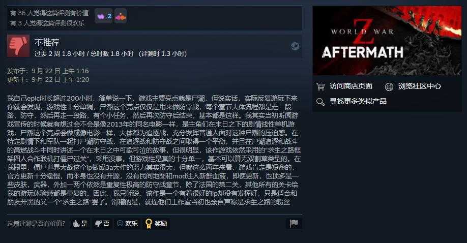 截止发稿,《僵尸世界大战:劫后余生》Steam共收到398篇测评,其中66%为好评,Steam评价为褒贬不一。玩家对于游戏不满的地方主要在于作为加强版游戏新内容过少,以及一些游戏优化问题。