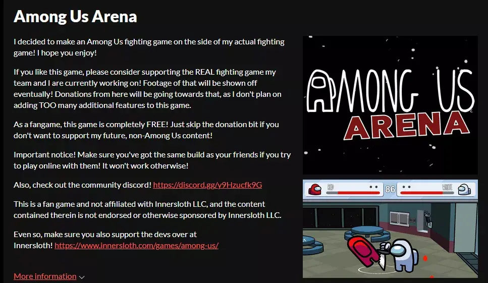 这部游戏被定名为《Among Us Arena》,是给船员们准备的格斗竞技场,使用Unity引擎制作,在itch.io网站上提供免费下载。