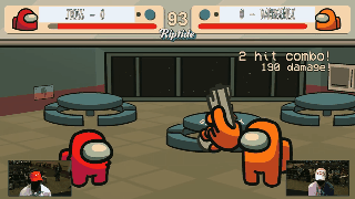 但Starcutter是一位核心格斗玩家,他在游戏的格斗系统上下了很多功夫。《Among Us Arena》采用了传统格斗作品的血条、计时、三局两胜等设定,同时引入了冲刺、防御、船员被地面或墙壁弹回的物理碰撞,以及使用攻击打断敌人动作时会产生更大硬直的Counter机制。