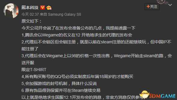 以后国服新的绝地求生账号将只能由年满18周岁的QQ用户进行购买,以前在steam上注册绝地求生的玩家仍能继续玩,但不会再提供注册功能。