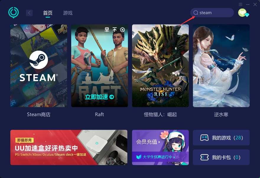 1:使用网络加速工具,比如UU加速器,搜索steam商店
