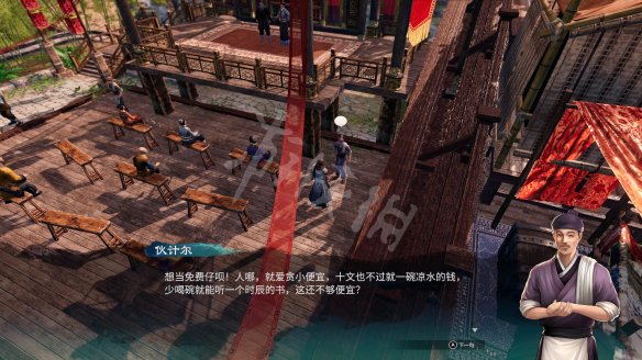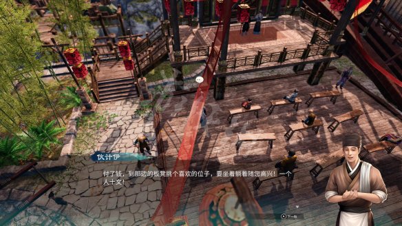 与伙计伊对话,花费一点小钱可以触发第一段说书演出。第一段演出后,与坐着的五名观众对话,可以再触发一段说书演出。