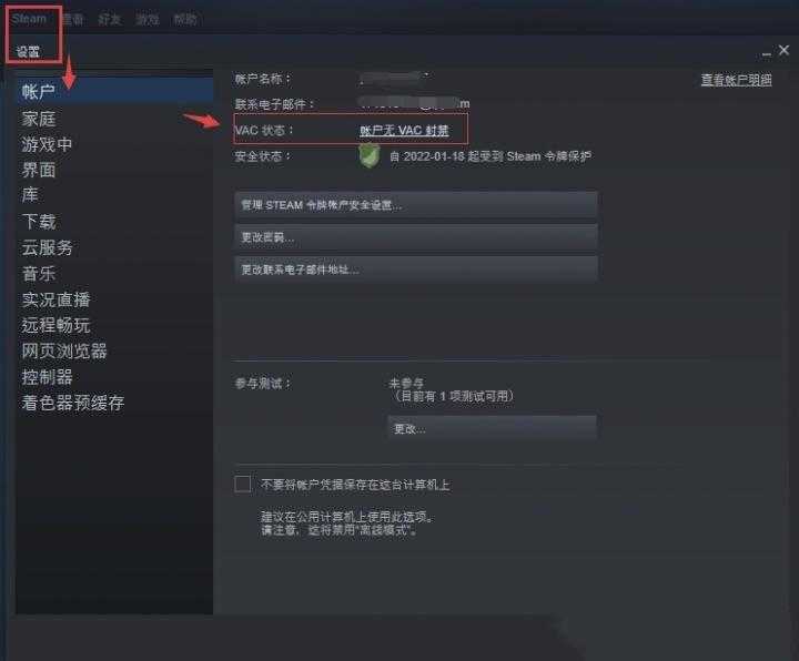 打开steam客户端,在界面左上角steam选择设置,在帐户栏目中点击VAC状态右侧的帐户无VAC即可。