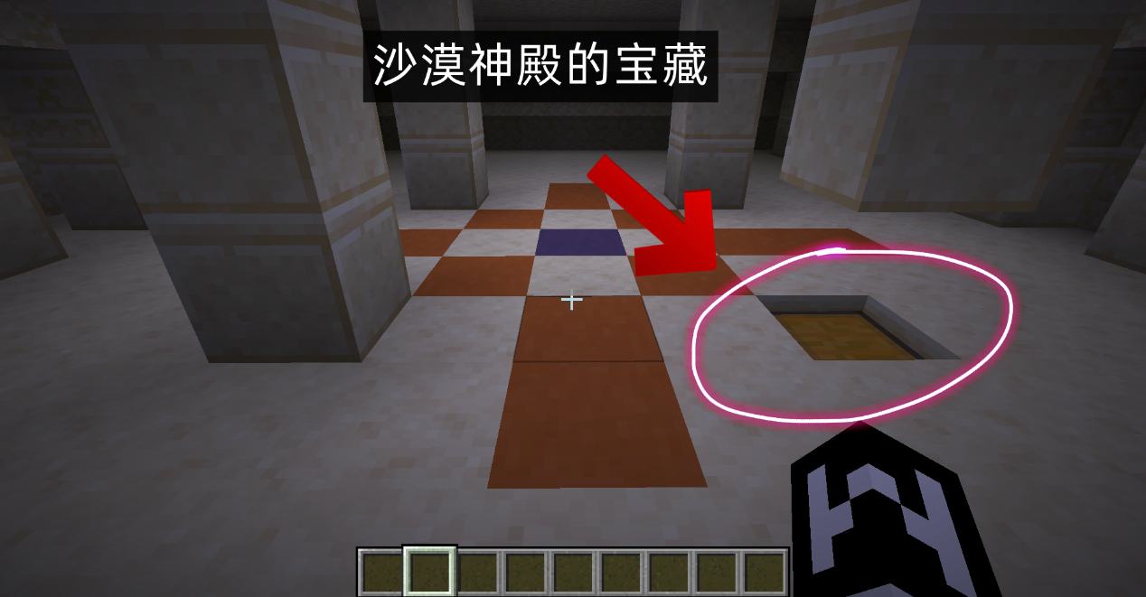 然而,关于沙漠神殿还有个不为人知的秘密,就是在背靠着沙漠神殿入口处的右手边的支柱下有个箱子。箱子中装满了制作TNT的材料。