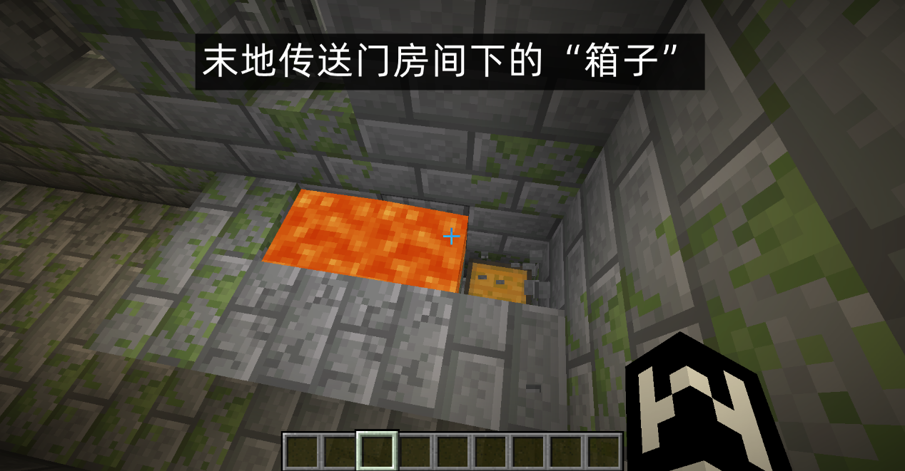 在要塞的末地传送门房间中有三个熔岩池,末地传送门框架下方有一个巨大的熔岩池,此外在传送门房间的入口处有两个小的三格的熔岩池。玩家只要将熔岩用桶全部收集,就可以看到隐藏在熔岩下方的箱子啦。箱子里放了一些进入末地的补给品。
