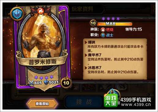 普罗米修斯虽然只有4星,但是作为一张战士卡,他最大的优势在于能够变身。这一点相当于他拥有2管血。10级的普罗米修斯变身前拥有3461点血,只比同等级的5星天秤座少273点,变身后血量更是达到了5021,与10级的阿伽门农比只少了19点!也就是说,10级的普罗米修斯变身前后总共血量有8482,经得住好几轮揍!