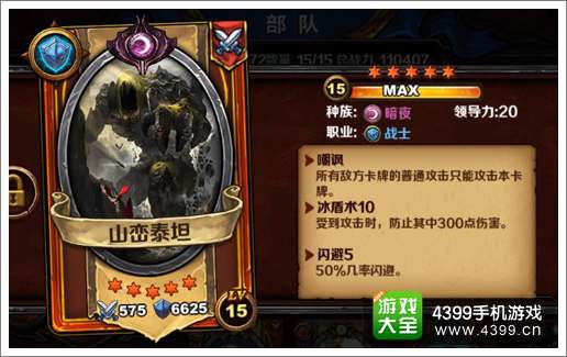 山峦泰坦的实用在于他绝对给力的技能。10级时冰盾术能提供210点普攻减伤,到了13级提升至300点。这算是一个比较基础的减伤技能。闪避则是他最强大的技能了——8级解锁的40%闪避,15级时可以提升至50%,也就是说,当对面没有破甲卡时,你的山峦泰坦有可能承受一轮完全不掉血的普通攻击,如果再配合上我方的群魔免疫或者群魔反射卡而对方有没有法术穿透卡牌在场时,可以说是完全不受任何伤害的存在!如此给力的T,绝对不能错过!