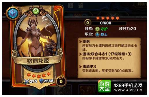 血量方面,10级的钢姬拥有5115点血量,算不上太多,但是也符合一个常规5星T应有的血量。但是她的技能我就不得不感慨了——这个世界上怎么会有这么变态的战士!钢姬已经超越了战士,绝对是圣斗士的存在啊!进场联合斗志增加的微量攻击暂且不提,仅仅雷盾术让自身最多只承受300点伤害这一技能的存在,简直可以说是逆天。在对方没有破甲卡牌的情况下,一个钢姬足够你顶住4轮攻击了!整整4轮啊!敌方的其他卡牌说不定已经被你打残打灭了!而好不容易打掉你的钢姬以后还要面对你满血的其他卡牌……估计对面玩家都怒砸手机了。