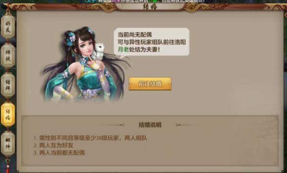 首先玩家需要等级达到38级才可以参与结婚玩法,想要进行结婚的两位玩家,需要性别不同,互为好友,两人当前都没有配偶。然后组队到洛阳月老处结为夫妻。