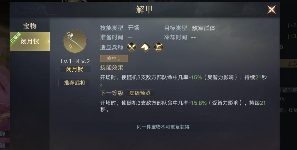 不仅如此,《荣耀新三国》中将多余的武将拆分后,还可以得到相应的宝物。宝物搭配合适的武将后,不仅可以大幅度提升武将的擅长能力,甚至还可以让他“转职”,具备多重身份,比如辅助刘备,可以用屯田令或青囊书,增加治疗量,也可以用雌雄双股剑或兵符,在保障治疗的同时,也能具备一些输出能力。