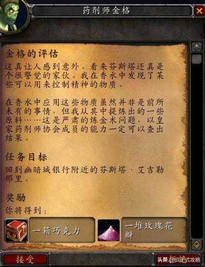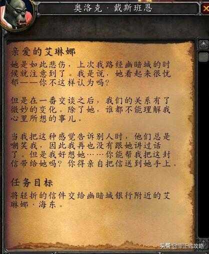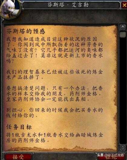 以部落为例:在幽暗城的银行附近,找到这位艾琳娜女士,将信件交给她之后,旁边一位叫芬斯塔·艾吉勒的男性亡灵会再次出现感叹号任务,接取任务之后需要你去找幽暗城的旅店老板购买一瓶古龙水和一瓶香水。