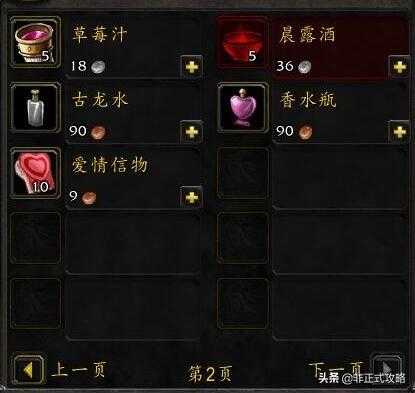 首先,在怀旧服“情人节活动”期间,玩家前往主城的旅店老板那里可以购买到以下三种道具,分别为:古龙水(一瓶可使用10次)、香水瓶(一瓶可使用10次)以及爱情信物。