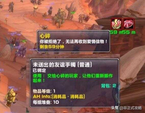整个过程看似非常繁琐,其实花不了太多的时间,需要注意的是并非每一次赠送礼物都能得到对方的友善回应,偶尔你也会有被拒绝的时候。这个时候,身上就会挂着持续一小时“心碎”BUFF,有这个BUFF的存在就无法和NPC对话拿“谢礼”了,唯一能解此BUFF的道具就是之前“谢礼”中开出“未送出的友谊手镯”,并且只能对其他玩家使用,无法对自己使用,因此想要效率拿免费BUFF的话,最好的方式是两个人一起拿,避免中了“心碎”BUFF后还得到处找人帮解以至浪费太多的时间。