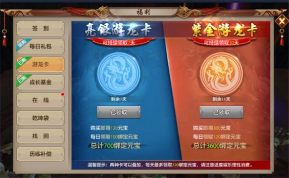 紫金游龙卡象征着尊贵,单从名字就让人由内而外的心生敬畏。紫金游龙卡是30日的礼包,充值30元立刻获得300元宝,而后每日还会获得120绑定元宝,总计300非绑定元宝和3600绑定元宝。这种每日伴随着少侠开启新一天生活的月卡是多么令人欣慰。虽然它是一种持续领取的月卡,但是这样可以更有效的帮助“剁手党”少侠管理自己的小金库。