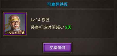 4、铁匠铁匠是一个比较关键的东西,他能在一瞬间让你秒出一件装备,我们这里主要就是想说铁匠的事。铁匠怎么用?见过很多朋友喜欢在升级主城的第一时间把铁匠给招了然后秒装备,但发现也秒不光时间,而且秒完第一件,第二件材料不够了,就等着吧,然后铁匠一到点,跑了……是不是很郁闷,再生产的时候下一个铁匠还没来。怎么保证免费铁匠的最大化利用?个人有一个小建议,大家可以参考一下。举例:13级主城完成会给一个缩短17小时的铁匠,时间是24小时。那么你先别招。先去看你的材料量,至少还能生产2件装备的话(也就是各样6个)就可以启动了。先去生产一件长时间的装备,比如绿头是24小时,等过7个小时以后,你直接招铁匠把剩下的17个小时秒了,然后生产下一件绿头或者绿甲什么的(绿弓绿马也行),这样还得生产7个小时,这个期间,你就要疯狂去扫野了,尽量保证作坊生产的材料和扫野所得的材料能够保证时间延续(有作坊加速和募兵翻倍的活动时候,效果显著)。以此类推,笔者在一个免费铁匠期间一共打造了2弓1马2头1甲6件绿装,而且第七件绿装也再生产并缩短了17个小时。这样可以算一下,一共缩短了7*17=119个小时的生产时间。其他铁匠就不举例了。当然在此期间,你不要生产印和符,那个32小时太长了,非要生产的话,要么起头,要么掐尾。