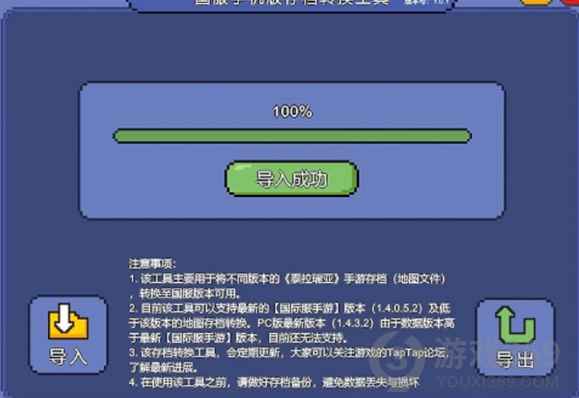 5、显示【导入成功】就完成啦,导出后记得将文件存放在【Android/data/com.xd.terraria/代表身份的数字/Worlds】中。