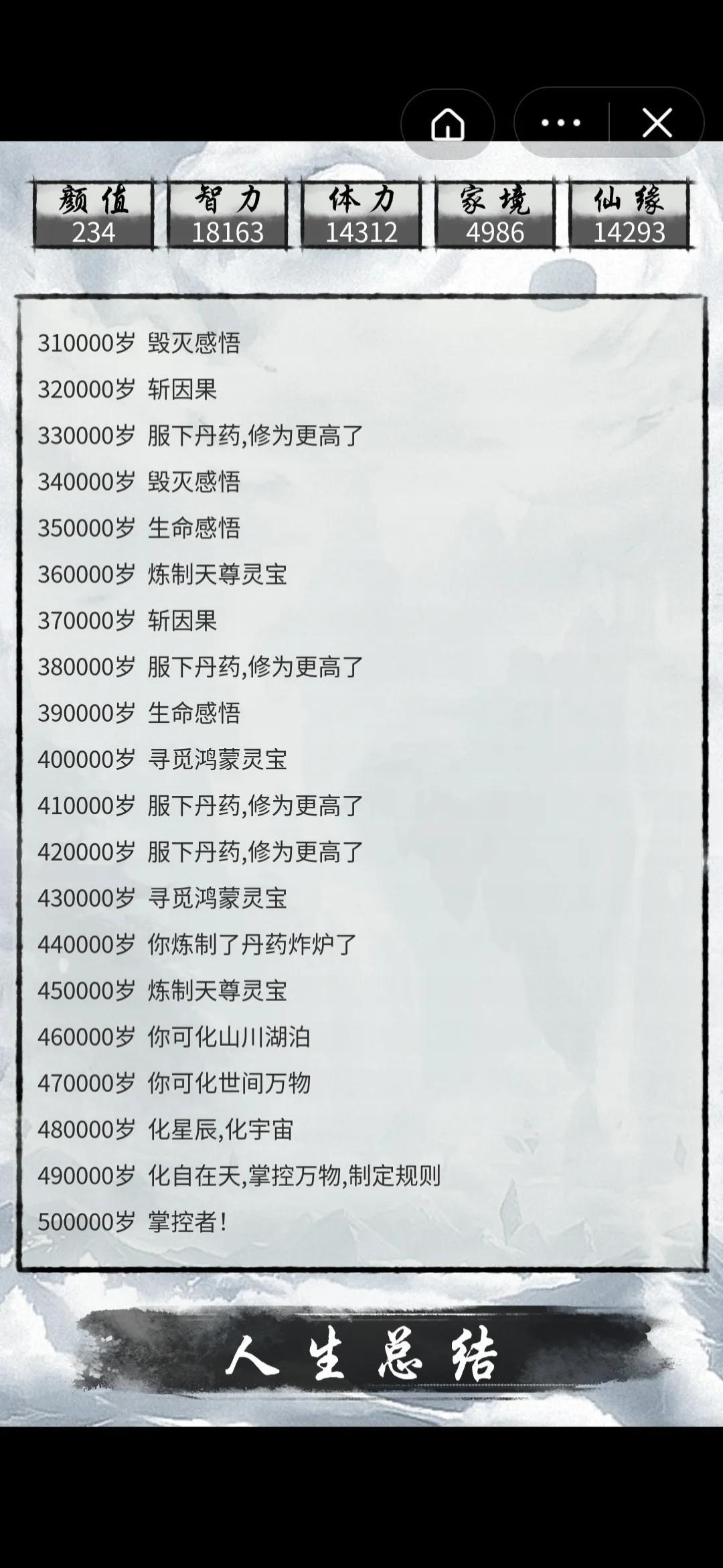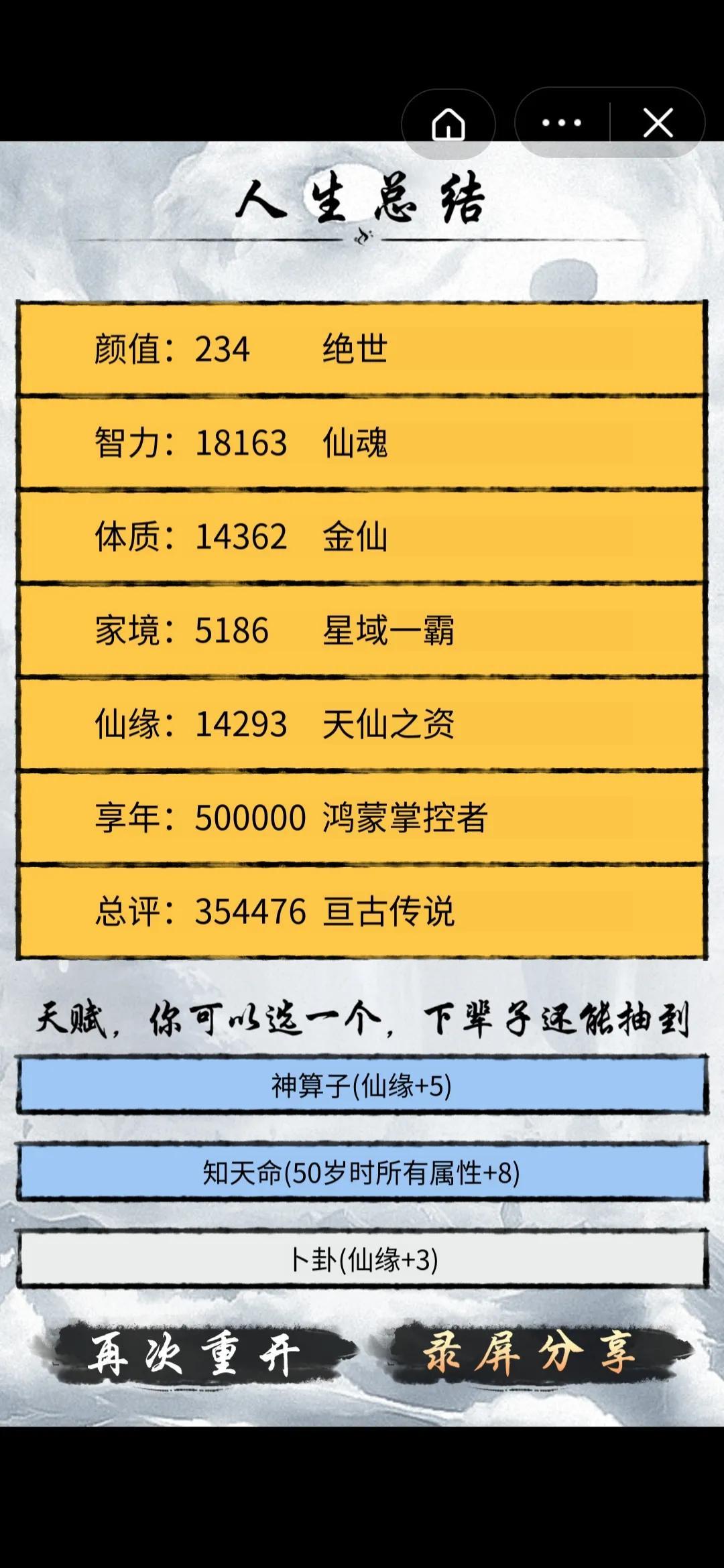 我开局把四个属性平均每个都放入五个属性点,然后再随便选择了一些天赋,没想到居然……我活了50万岁!