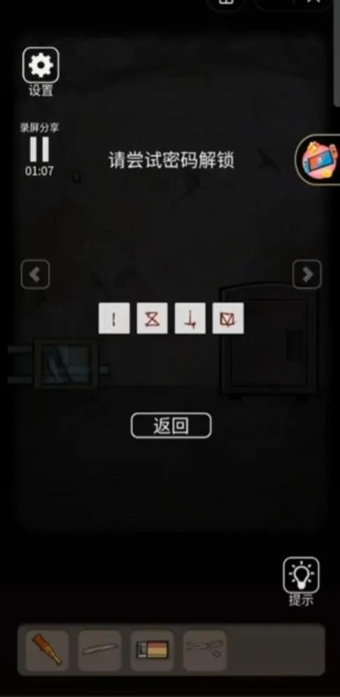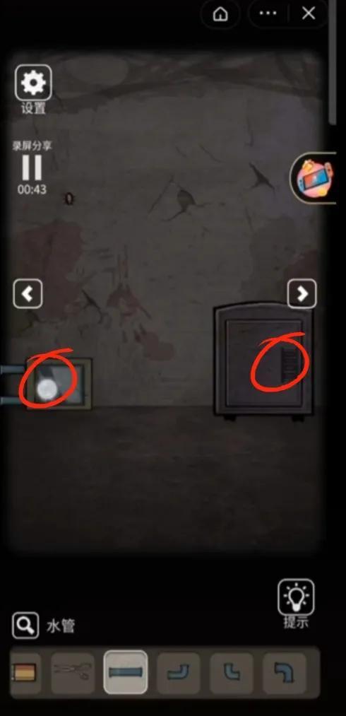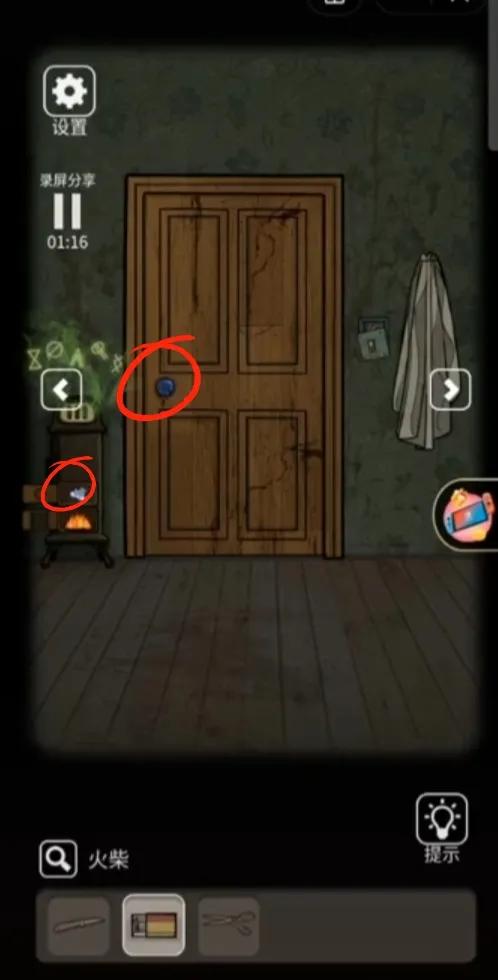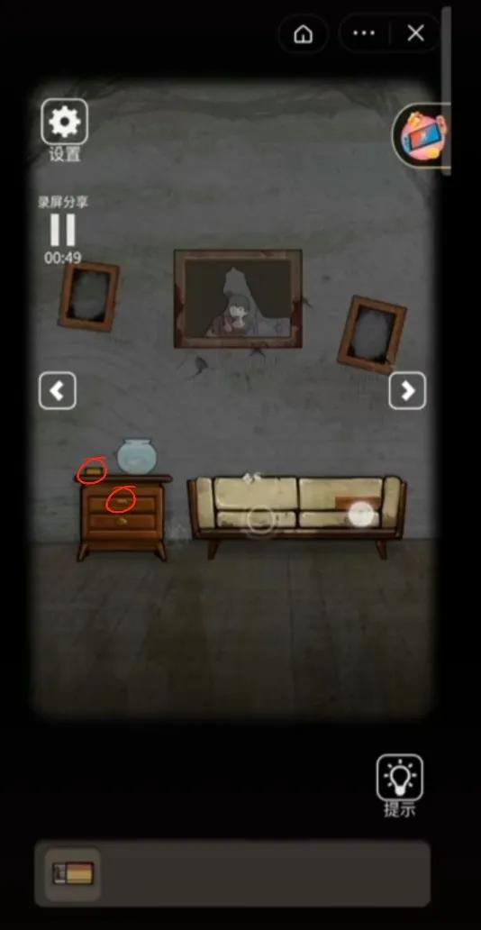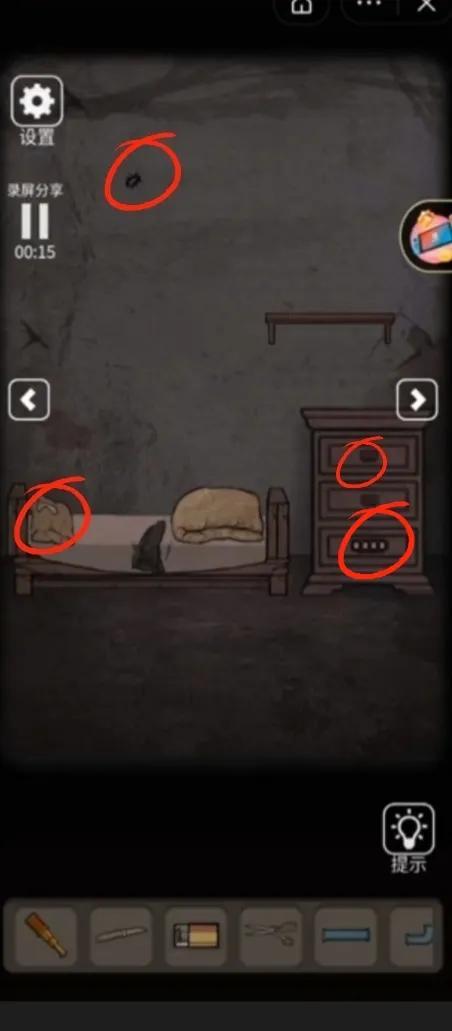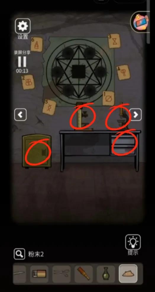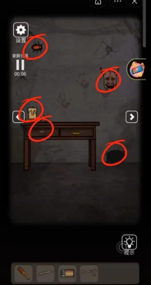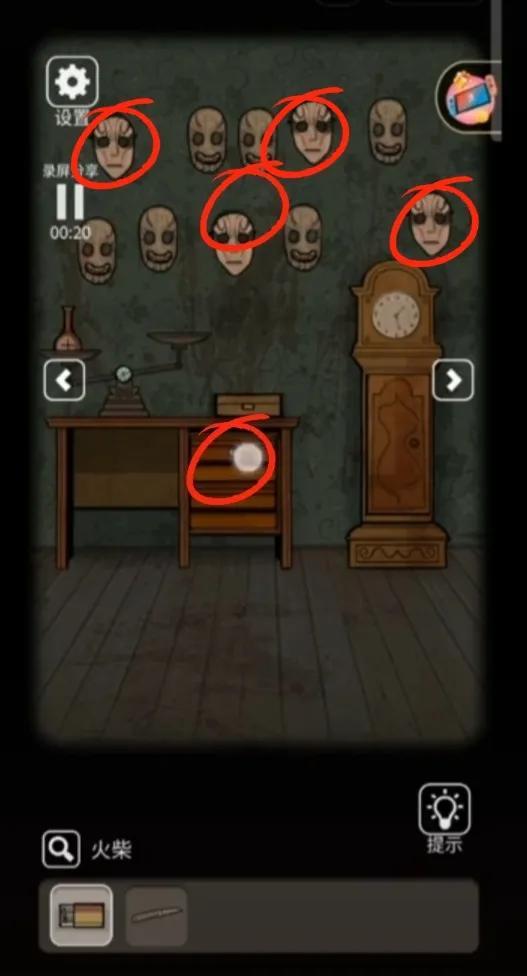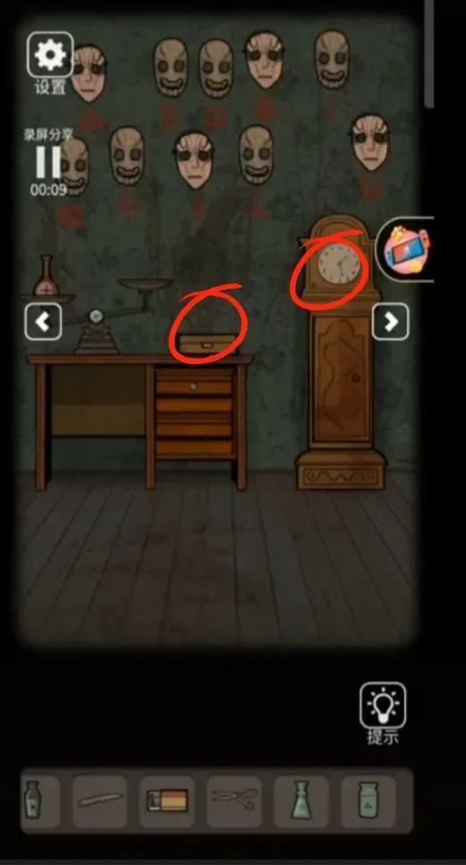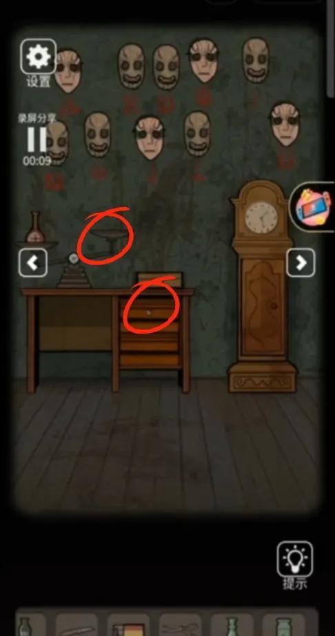 打开抽屉,获得水管。按下面具所有的牙齿(按错就会从来),获得奶酪。点击墙上的虫子(每一个场景的虫子都点一下,虫子画的是密码)。奶酪给洞里的老鼠,获得水管。火柴点燃蜡烛,把纸条放在上面,获得密码9582。