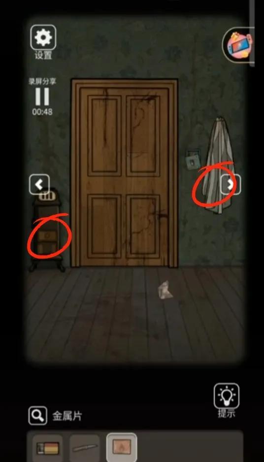 点击桌柜放大,打开第二层,获得“金属片”。打开第四层,获得“碎片4”。上面的面具点开,有后面要用到的密码。