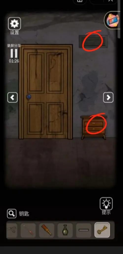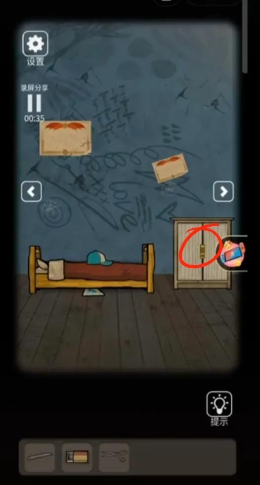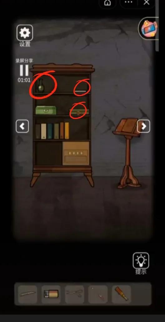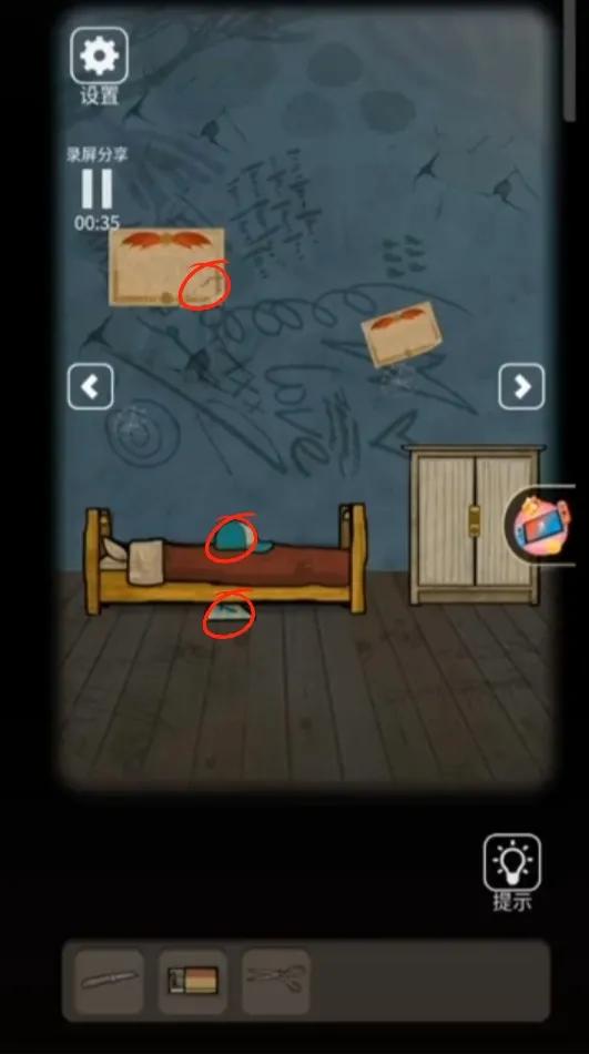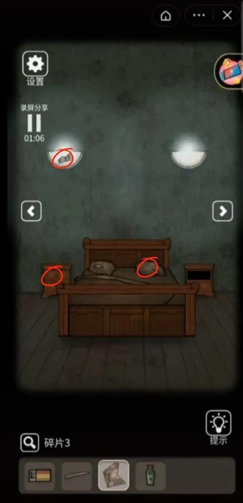 挪开枕头,获得“碎片1”。打开床头柜,获得“药水1”和“剪刀”。左边的灯,获得“碎片2”。