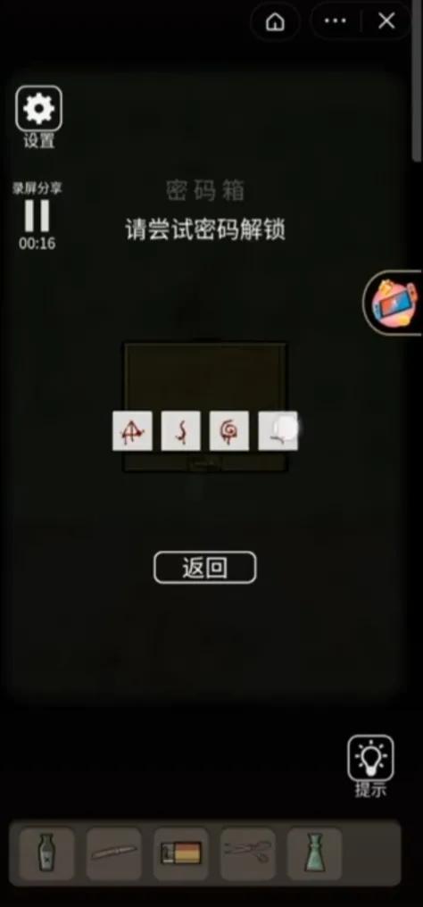 密码箱根据面具输入密码,打开获得“药水4”,“碎片5”。点击相框放大,把“碎片”放上去。