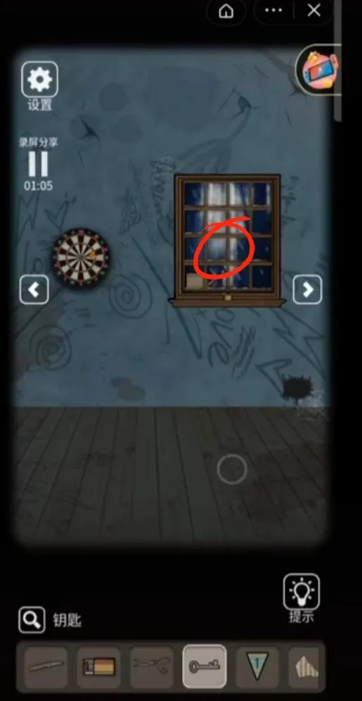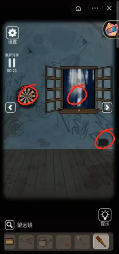 把蚯蚓给鸡吃,获得日记一角。用望远镜查看人影做出的动作。点击飞镖盘获得飞镖。