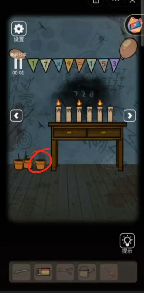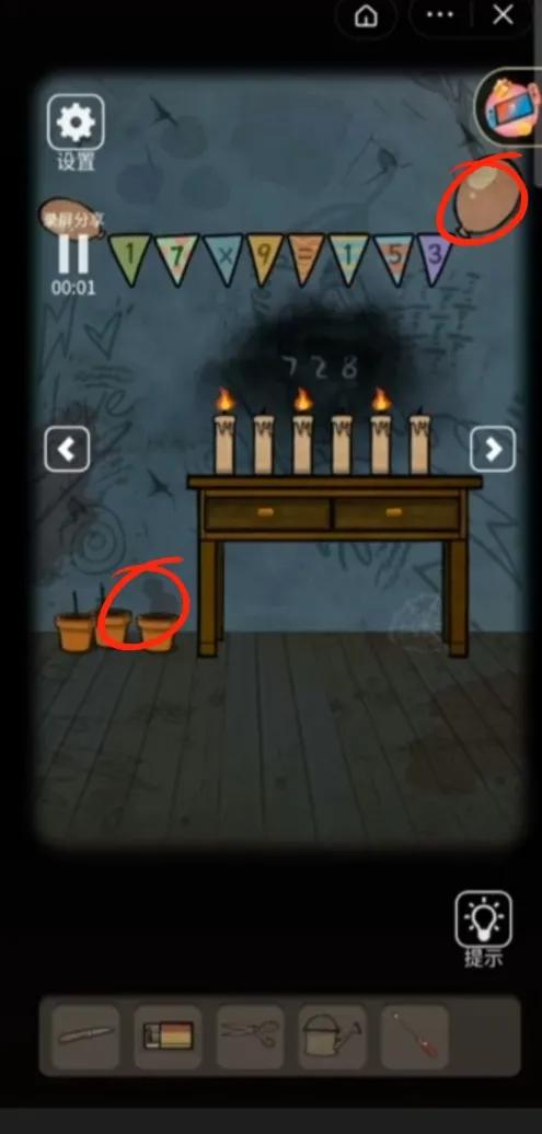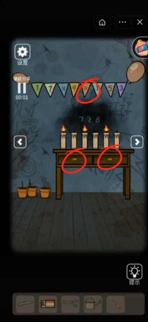 点击抽屉获得日记一角,螺丝刀。把彩旗放在上面,挪动彩旗17*9=153。点燃蜡烛,获得密码。