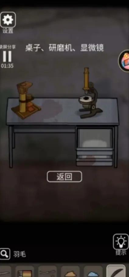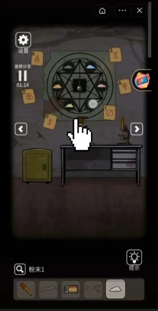 树枝放进研磨机,得到黄色粉物。打开抽屉获得无机物,把培养皿和无机物放在显微镜下观看,获得无机物钥匙。左下角柜子用密码624打开,获得蟾蜍卵。把蟾蜍卵放进研磨机,获得蓝色粉末。
