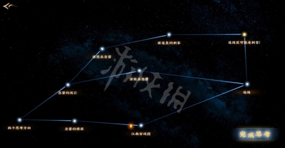 换个思考方向选择【忽雷的情报】和【忽雷的死亡】,【忽雷的死亡】选择【谁想杀忽雷】和【谁能杀忽雷】,【谁想杀忽雷】分析出【被追查的刺客】。