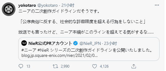 有意思的是,在《尼尔》系列二次创作规章公开之后,横尾太郎在自己的推特账号上,就规章中的某条要求发表了自己的看法: