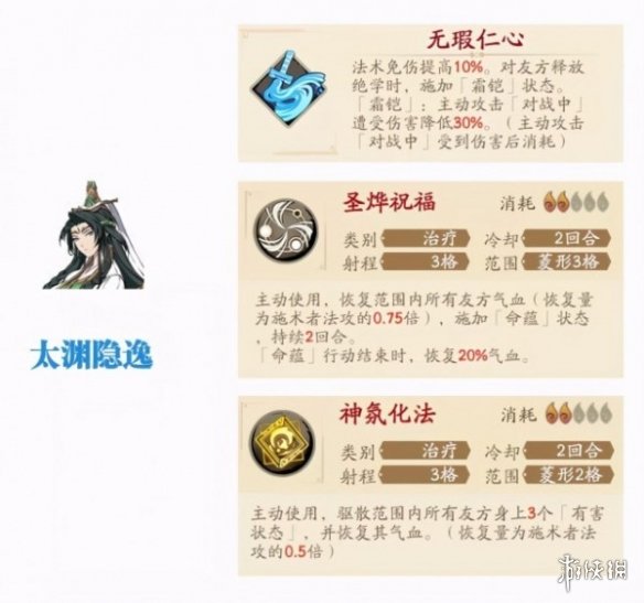 首先太渊隐逸的天赋【无瑕仁心】可以在对友方释放技能后添加【霜铠】状态,而【霜铠】状态为友方英灵带来的主动攻击减伤30%的效果是我们越级打boss的一个核心技能