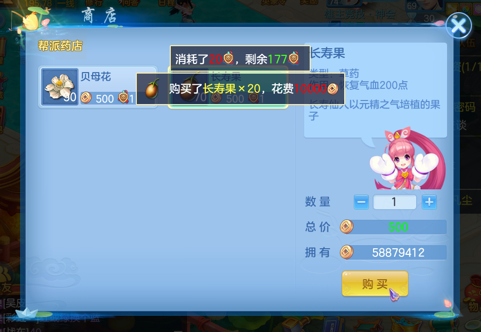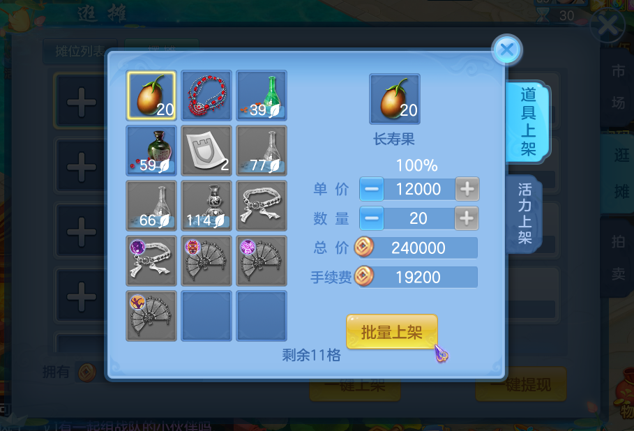 在帮派药店中我们购买一组20个长寿果,只需要花1万铜币,然后我们将它上架,定单价一万一到一万二都可以,卖出可以获得23到24万铜币,一组净赚20+万。卖得越多赚的越多,因此小伙伴们一定不要放弃获得帮贡的机会,可以说帮贡就是“钱”呀。
