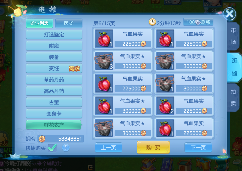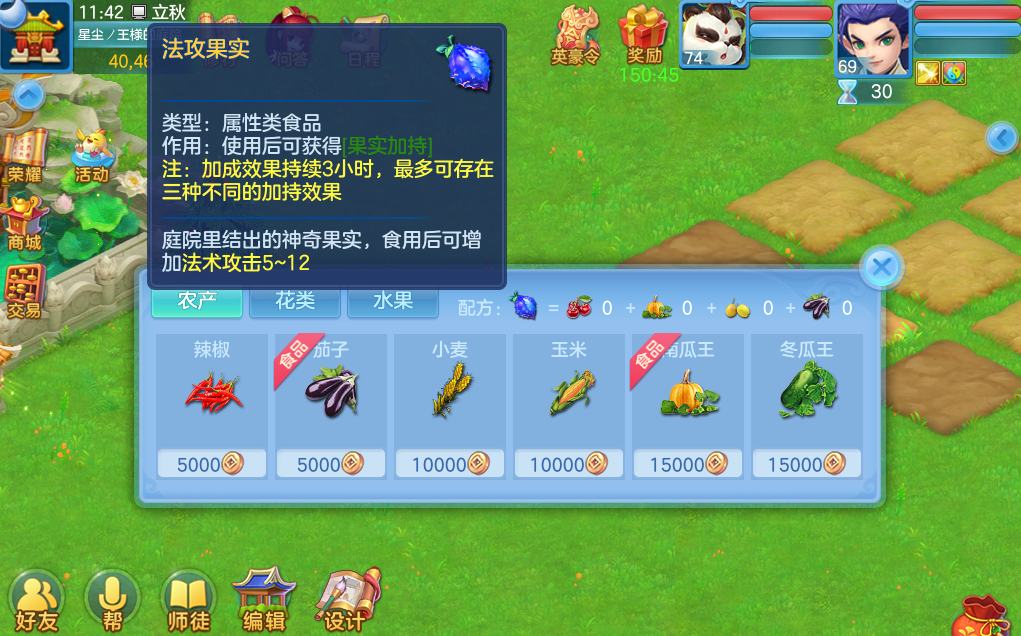 庭院每天都会刷新食品/果实合成的配方,按照配方种植农作物,成熟后收获,再合成食品/果实即可上架卖出。在交易-逛摊-鲜花农产处可以查看果实的定价大概是多少,稍微观察一会儿即可得知目前哪种果实比较好卖。比如吉祥目前所在的服务器,30万铜币的气血果实很快就卖出去了好几个,小伙伴们可以根据自己所在服务器的情况进行种植合成。