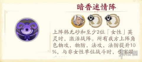 激活条件:韩无砂与至少两名女性角色同时上场可激活此战阵。