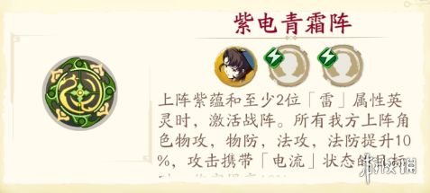 激活条件:上阵紫蕴和至少两个雷属性的角色时激活战阵
