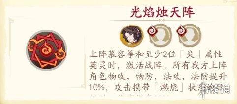 激活条件:阵慕容筝和至少两个炎属性的角色时激活战阵,