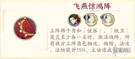 激活条件:在上阵韩千秀和侠客、铁卫角色至少各一名时激活战阵。
