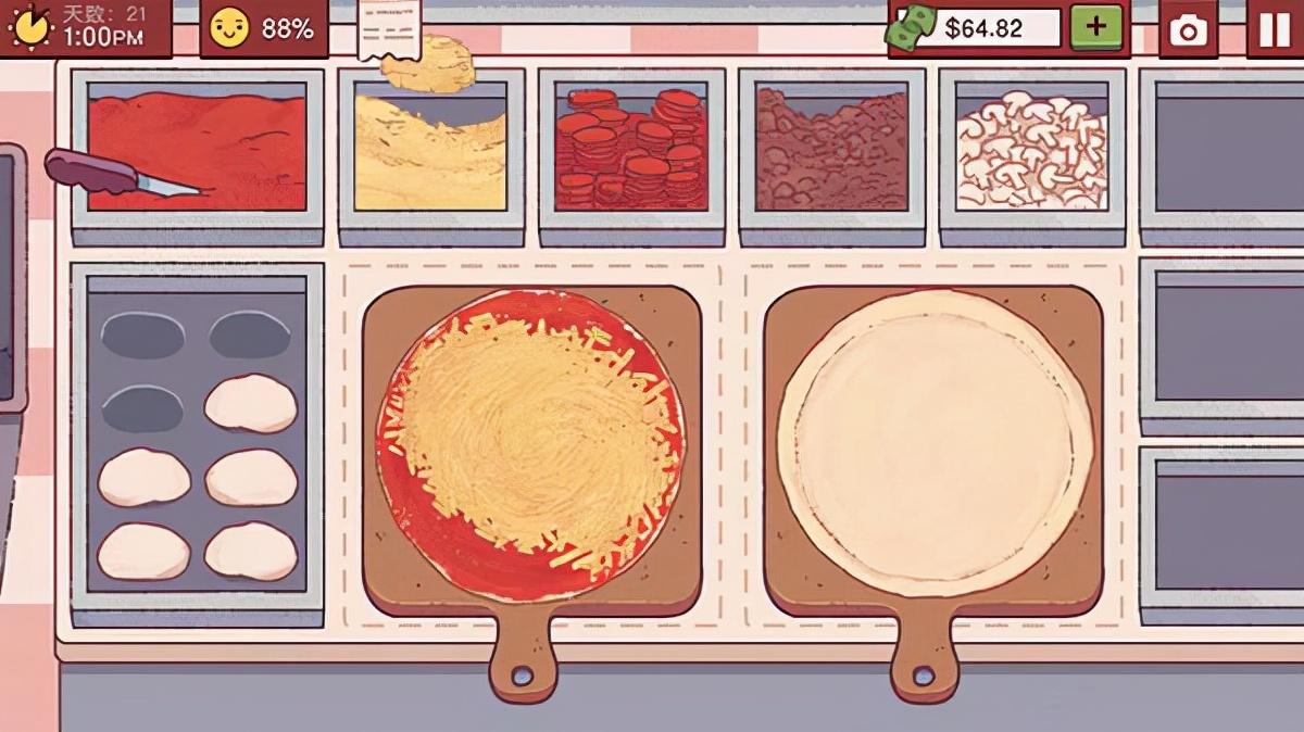 这游戏的设计者大约是处女座的要切的对称还要快的话,切的时候先快速点一下刀,直接就是标准的45°的一刀,然后在居中水平线下方一点再切一刀,最后一刀可以慢一点,仔细对准再切。4、左边一个料右边一个料叫双拼,外面一圈料里面一圈料也叫双拼来自评论区大佬的发现,亲测有效,好像给的小费会多一点,不知道是不是因为分成两圈摆更容易摆得对称。5、配料和家具不要太着急解锁,每次都留下至少30(最好是50)块的备用金万一第二天炉子坏了又遭小偷了而且饼全做砸了,还有点家底兜着不至于破产。配料只要在对应的节日前解锁就好了。6、炉子可以同时烤两片饼顾客点了两片或者更多的饼时,先丢两个饼皮到桌上,酱料和芝士可以两张饼一起涂然后右边的饼先放料,放好后丢到炉子上,开始做左边的饼左边的饼做好后,右边的饼应该已经移动到炉子中间了,只要入口处看不到饼皮,就可以放入下一张饼接着挪到案板处,拖出第一张饼切了,切完后正好第二张饼也出来了比较节约时间