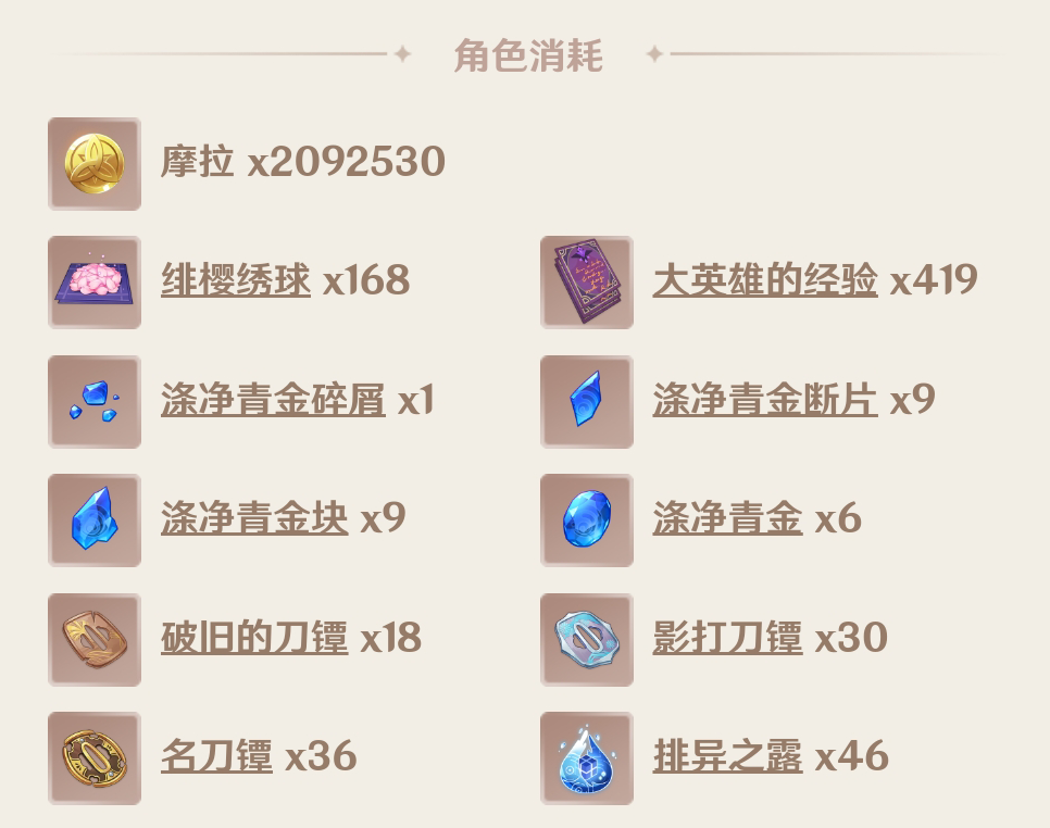 绯樱绣球168个、排异之露46个(无相水掉落)、破旧的刀镡18个、影打刀镡30个、名刀镡36个、涤净青金碎屑(绿色突破材料)1个、涤净青金断片(蓝色突破材料)9个、涤净青金块(紫色突破材料)9个、涤净青金6个(橙色材料)。