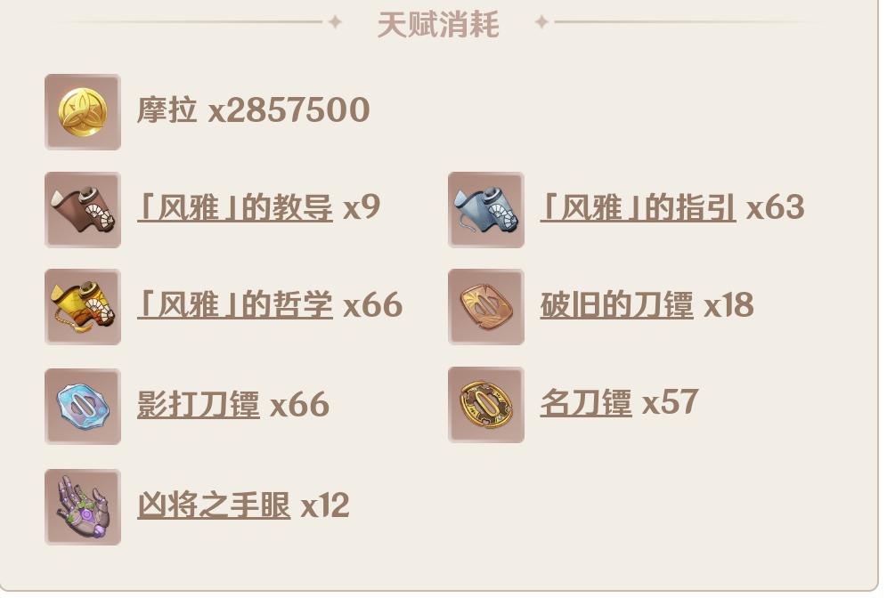 风雅的教导(绿色材料)9个、风雅的指引(蓝色材料)63个、风雅的哲学(紫色材料)66个、破旧的刀镡18个、影打刀镡66个、名刀镡57个、凶将之手眼(雷神周本材料)12个。需要2857500摩拉。