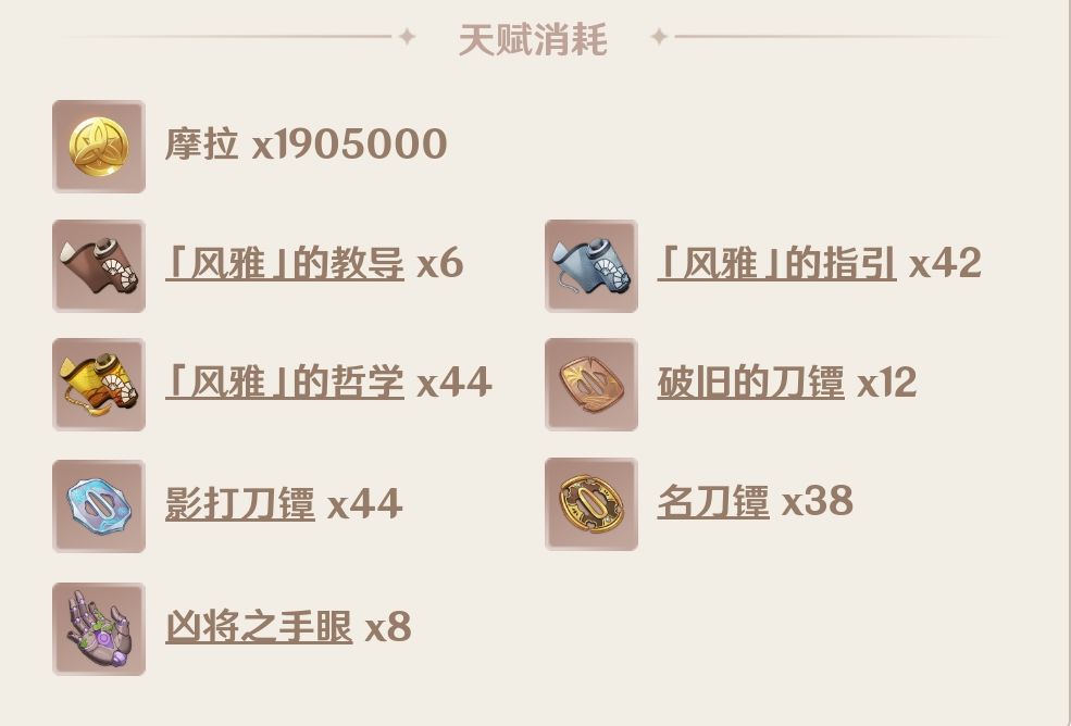 风雅的教导(绿色材料)6个、风雅的指引(蓝色材料)42个、风雅的哲学(紫色材料)44个、破旧的刀镡12个、影打刀镡44个、名刀镡38个、凶将之手眼(雷神周本材料)8个。需要1905000摩拉。
