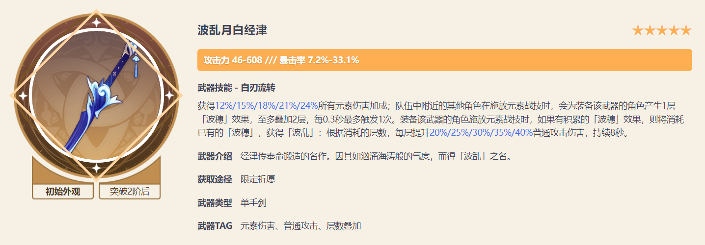 五星武器首选波乱月白经津,能够为绫人提供高额的暴击,并且在队伍中其他角色使用元素战技之后,提高绫人的普通攻击的伤害,非常适合绫人佩戴。但是需要注意的是,因为波乱的武器特效需要队友帮助触发,因此波乱不适合在单刷或者少人的情况下使用。