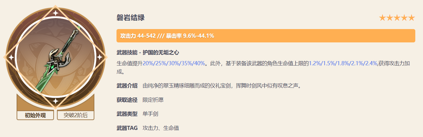 其次选择磐岩结绿,这把武器能够为绫人提供高额的暴击,同时特效提供绫人所需要的生命值,并又将生命值转换为攻击力,绫人的特性非常适合这把武器。