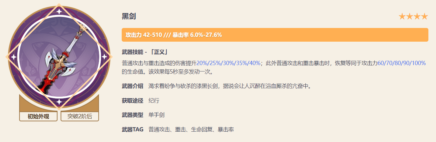 四星则推荐黑剑,黑剑能够提供暴击,并且提升普通攻击的伤害,同时带有恢复效果,提高生存能力,也是非常契合绫人的一把武器。