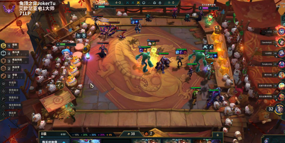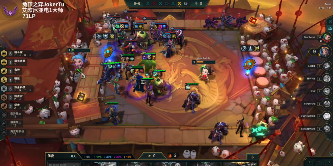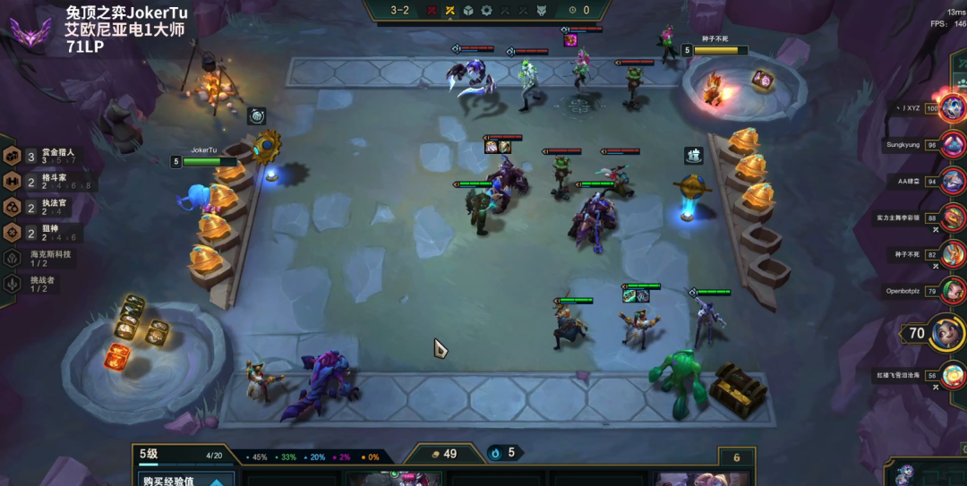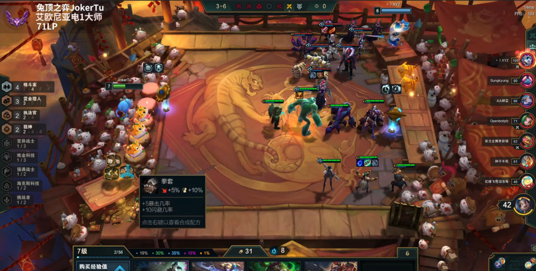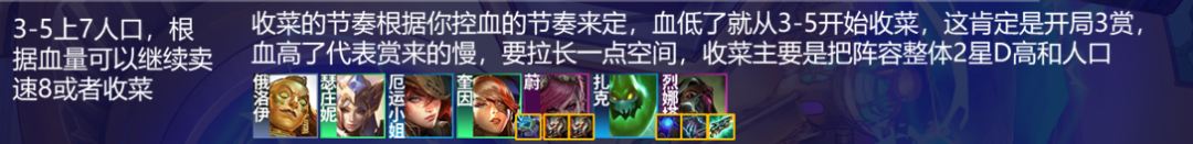 3-5上7人口,如果是开局连败,就准备收菜了,连败在8以上了够用了,收菜的主要逻辑其实很简单,就是尽可能的羁绊多、两星多、装备多、高费棋子多,如果血量控制的不好,30以下了,就要D牌提升更多质量7人口收菜了,有时候遇到赌狗质量很高,不能收菜也正常。