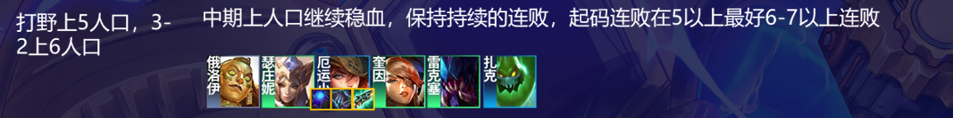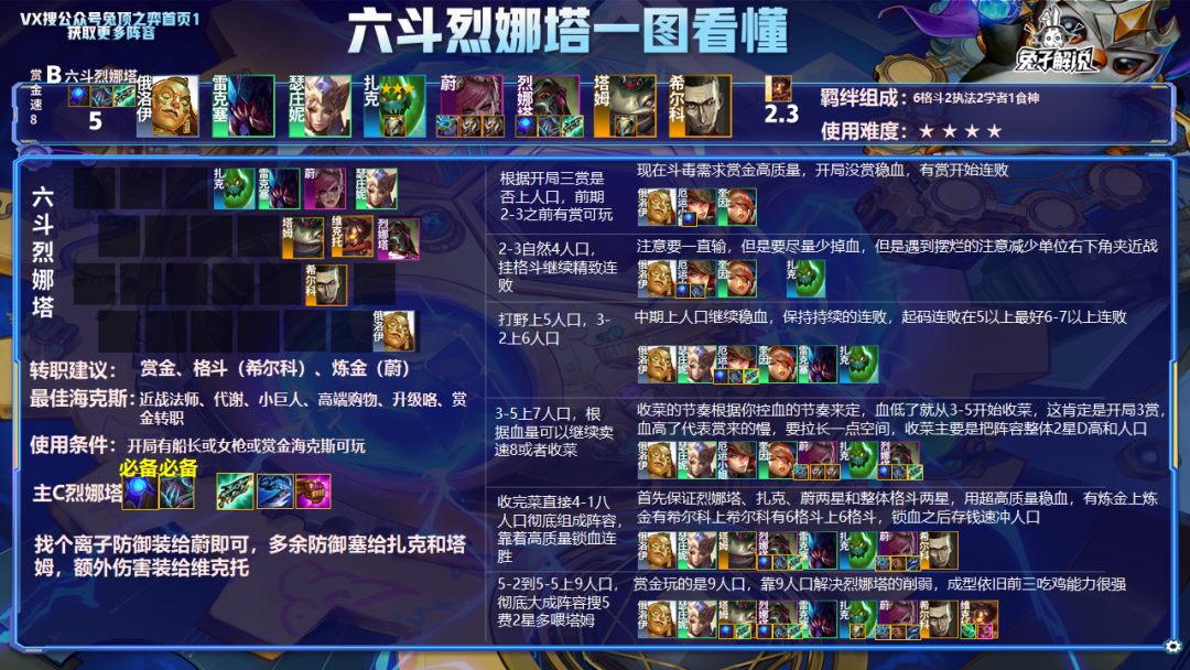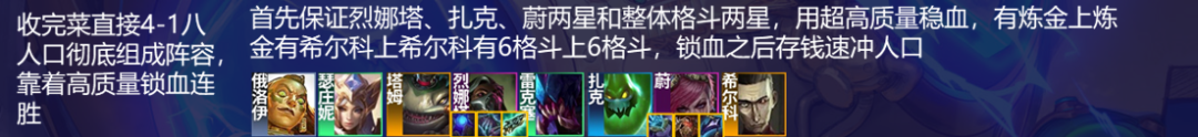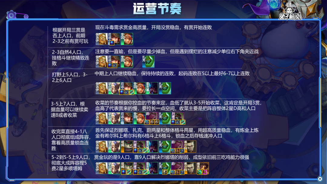 开局有机会赏再玩,或者也可以类似德莱文纯约卖血玩,整体逻辑一致,都是直接极限卖血速冲8人口,4阶段就拥有5阶段的高质量,然后5阶段有6阶段的高质量将8人口阵容玩成9人口来强势,因为斗毒和德莱文都拥有成型即锁的特点,开局3赏不上人口纯连败并且尽可能减少掉血,减少掉血主要靠女枪,遇到卖血可以奎因女枪夹着俄洛伊在右下角来降低战力,开局没赏可以先上人口稳血嫖卡,2-3之前还没赏就可以准备玩别的了,然后一直卖血,打野上5人口,3-2上6人口,找烈娜塔装备给女枪稳血,3-5开始根据连败情况,上人口准备收菜,血量控制差较低冲不到8就D一波多凑一些两星收菜,然后4-1立刻冲到8人口,直接把阵容彻底组成靠着2星烈娜塔和整体高质量连胜,接着5阶段直接上9人口,彻底组成阵容,如果妮蔻转职多的话,也可以8人口赌三星烈娜塔和蔚来吃鸡。